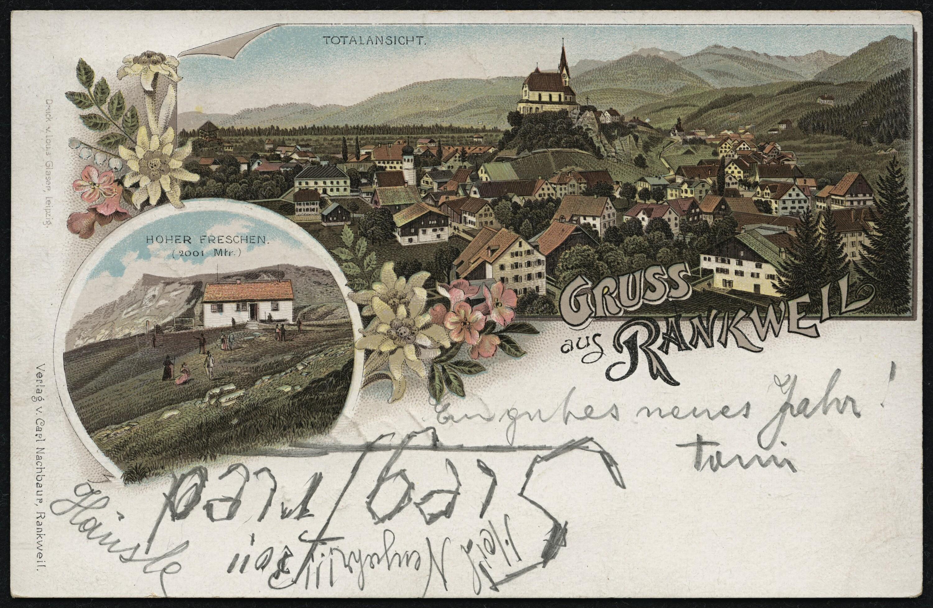 Gruss aus Rankweil : Totalansicht : Gasthaus zum hohen Freschen des Franz Xav. Kiene : Gasthausgarten von Franz Xav. Kiene : Hoher Freschen, 2001 Mtr. : [Correspondenz-Karte An ... in ...]