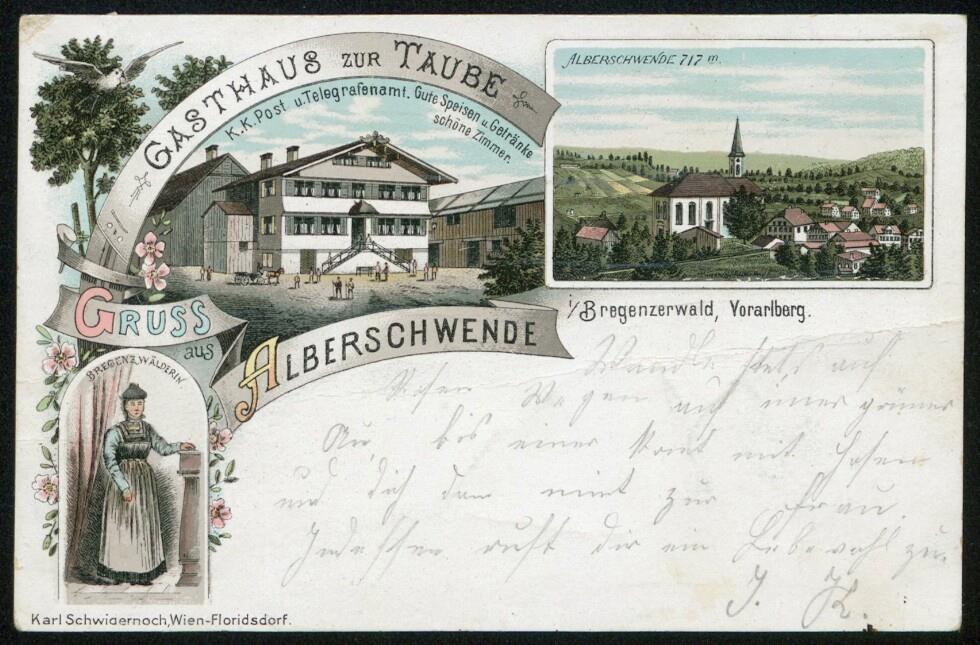 Gruss aus Alberschwende i/ Bregenzerwald, Vorarlberg : Bregenzwälderin : Gasthaus zur Taube K. K. Post u. Telegrafenamt. Gute Speisen u. Getränke schöne Zimmer : Alberschwende 717 m. : [Correspondenz-Karte An ... in ...]