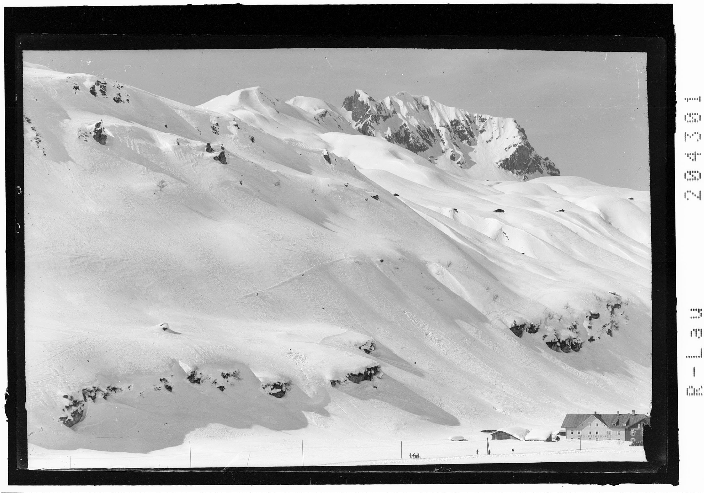 [Hotel Alpenrose in Zürs am Arlberg gegen Mittagspitze und Omeshorn]