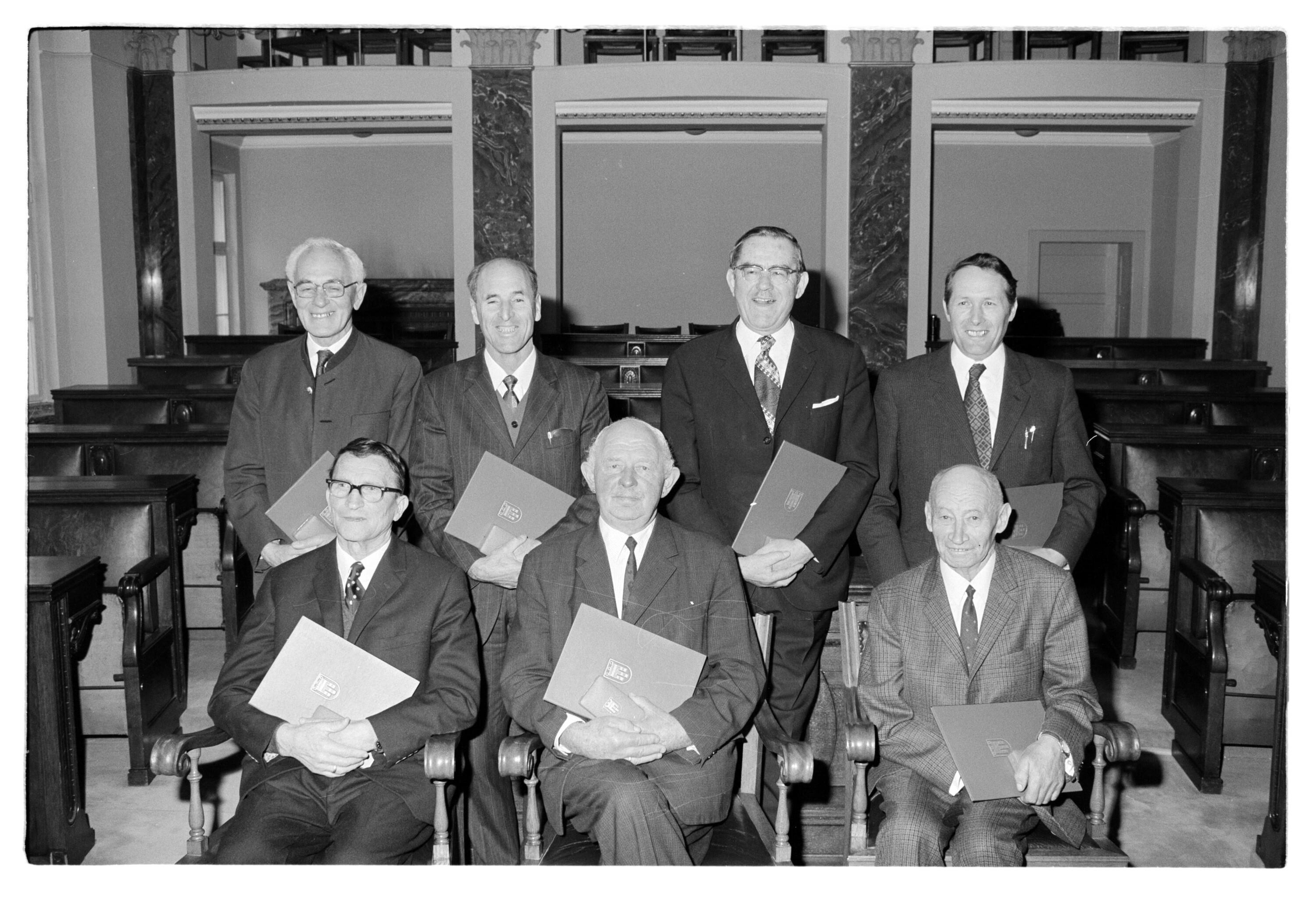 Dekrete und Titel durch Landeshauptmann an Beitl, Pass, Deszy, Dür, Grass, Hämmerle